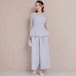 繊細なレーススリーブが華やかさを引き立てるブラウスと、エレガントなワイドシルエットパンツが見事に調和したセットアップ。