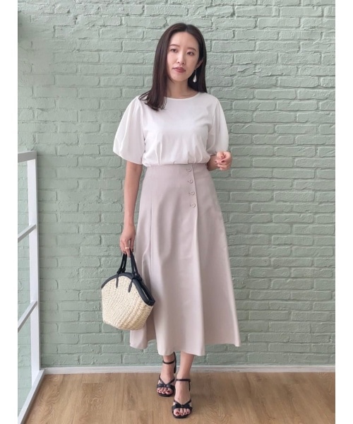 ふんわりと広がるパフスリーブが、シンプルな白トップスに程よい甘さをプラス。肩回りにボリュームが出ることで、顔まわりが華やかに見える効果も◎