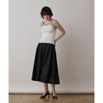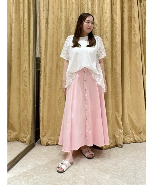 10ozの軽めなサーキュラーデニムスカートは、分量感たっぷりなのにとっても軽くて薄地なのでこの夏の主役アイテムです。トップはバックレースになっていて、華やかさとラグジュアリーさを感じられる1枚です。サイドの裾がヘムラインで腰回りもカバーできとっても重宝します。