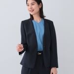 裏地なしで程良く伸縮性のある素材のジャケットはハリ感もしっかりあり着心地も◎ストライプの切り替えデザインがポイントのブラウスは