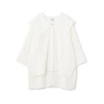 スクエアモチーフのジャガード素材でできたジャケットです。大きめのセーラーカラーがポイント。後ろは2枚重ね仕様なっており、パッと目を惹くデザイン性の高い一枚です。羽織りとしてはもちろん、ブラウス感覚でもご着用いただけます。