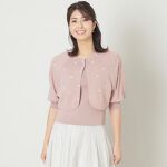 フラワーパーツをあしらったツインセットです。インナーはフレンチスリーブになっています。ボレロ単品でワンピース、スカートにコーディネートがしやすいアイテムです。