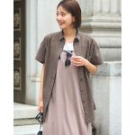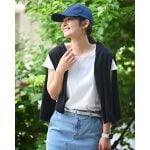 配色にした異素材のショルダーベルトがポイントのジャンパースカートに、オーガニックコットンを使用したレース切り替えのシャツを合わせて、同系色コーデに。