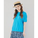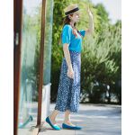 伸縮性に優れ、さらっとした肌触りのサマーニットに、花柄をプリントしたタックスカート。品のある可愛らしいルックスに。