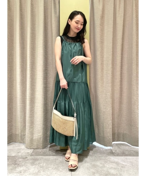 光沢感の綺麗なブライトローン素材のキャミワンピース。細かなプリーツテクニックが上品なボリューム感と動きを出しつつ、ふわっと軽い為重さを感じずに着て頂ける一枚となっています。体から離れる開放感のある着心地でボディラインを拾わず、真夏でもストレスのない着心地。