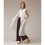 ドライタッチで清涼感のあるカラミツイード素材でお作りしたジレジャケット。繊維を絡ませながら織るカラミツイードは、軽量でスポンジーなお素材なので夏でもサラッとお召しいただけつつ、平坦になりがちな夏の着こなしのポイントになります。