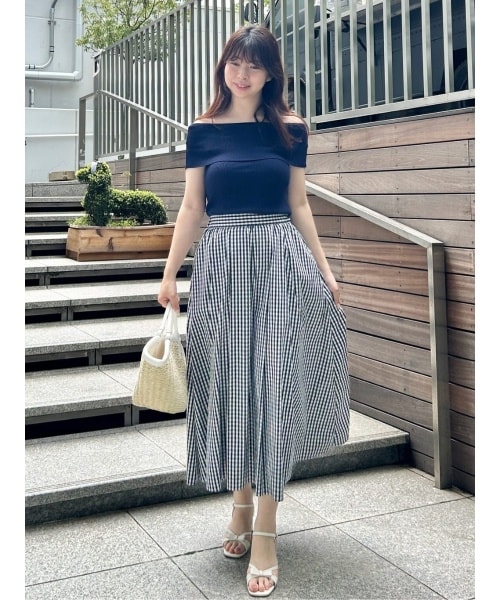 ネイビーでまとめた夏のフェミニンコーデに♪ あえてオフショルにして、トレンド感のある着こなしにしました。