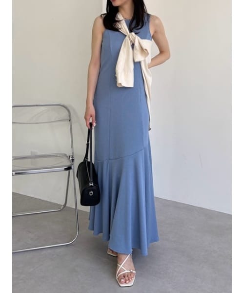 鮮やかなブルーのニットワンピースに サテンシャツを巻いて涼しげなコーディネート