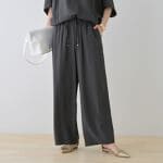 風通りの良いドルマンスリーブデザインのトップスは袖口広めなので涼しくも着られます!ストンと落ち感のある素材のボトムはボリュームが抑えられすっきりお召いただけます。ウエストの紐で多少の調節が可能!