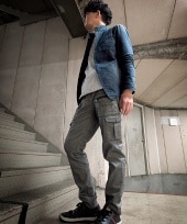 薄手のシャツでのコーデ。これから夏には、薄手のシアー素材のシャツと合わせて、見た目にも涼しげな合わせがオススメです!アシンメトリーなデザインのカーゴタイプのパンツは、膝下丈ですので、少し大人な雰囲気で合わせられる夏にオススメのパンツです!