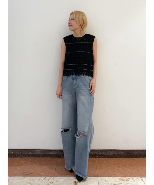 キカ柄のレース地にビジューとビーズのキラキラが華やかなレーストップス。ショート丈で作っているのでボトムのボリュームを気にせず使いやすいデザイン。ほどよい透け感とゆとりのある身幅のある作りですので暑い時期でも涼やかに着て頂けます。後ろファスナータイプ。