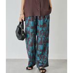 程よい存在感のある幾何学柄デザイン。生地は麻調合繊を使用したリネンの様な風合いとさらっとした肌触りが魅力です。ウエストゴム仕様で着脱しやすく楽な履き心地です。便利なサイドポケット付きなのも嬉しいポイントです。