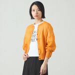【カーディガン】シアーな編地で作った、軽い着心地が魅力のニットブルゾン。前ボタンを全て留めて、トップスとして着てもサマになるデザインです。【スカート】裾に向かってプリーツが自然に消えていく仕様になっていて、全体的に柔らかい雰囲気です。ウエスト部分はゴム仕様。
