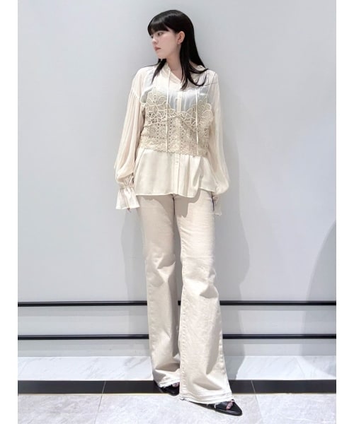 ブラウスは柔らかい生地感でゆったり着れる一枚。ビスチェがウエストマークになり、後ろ姿も綺麗に見えます◎細見えするフレアデニムはオーバーサイズのトップスと相性がバッチリです◎