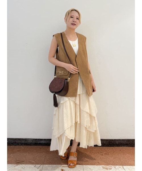BOHOスタイリングにぴったりなスエードジレ。上質なラムスエードを使用し、深みのあるキャメルカラーやナチュラルな風合いがポイント生地を贅沢に使用したティアードスカートはシンプルなスタイリングにも映える主役級スカートです。