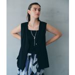 【着用サイズ Tシャツ:F ジレ:F パンツ:S】ドライタッチなストレッチ性のある生地を使用したジレジャケット。深めのVネックラインに、ウエストで切り替えたペプラムデザインが魅力の1枚です。シンプルコーデに羽織るだけでオシャレ見えします。