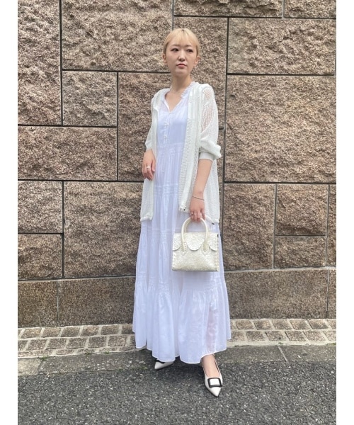 シルクコットン素材のティアードワンピース。羽織のニットパーカーとカービングもホワイトで合わせ、統一感のある爽やかなスタイリングに。腕を出すのに抵抗のある方は、透け感のあるシャツやパーカーを羽織っていただくのがオススメです◎