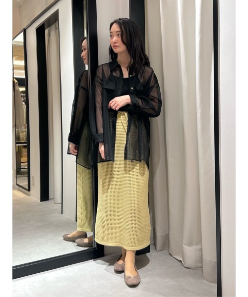 程よいハリ感のメッシュ素材を使用したオーバーサイズシャツ。衿やカフスにも芯を入れず全面透けている為、どこか華奢でニュアンスのある表情が魅力のデザインです。メッシュ編みのタイトスカートは大きめにあいた編み目から覗く素肌感を楽しめるデザインです。