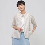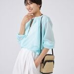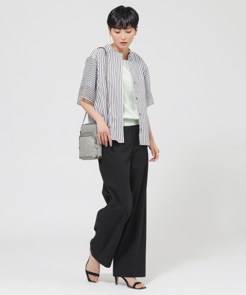 シアーなプリントストライプを袖にブロッキングしたデザイン。袖の内部にもう1枚袖を重ねたデザインで、縦横の重なりがギンガムチェックのように見える視覚効果と、透けにくいデザインにしています。パンツはワイドすぎない絶妙なシルエットで、足長効果抜群です。