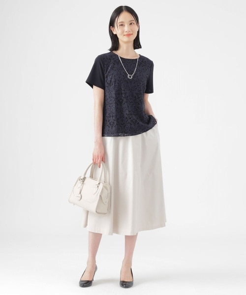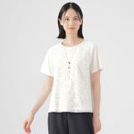 上品で涼しく快適な着心地のプルオーバーです。前身頃に幾何フラワー柄ラッセルレース、後ろ身頃と袖にスムース素材を使用した異素材組み合わせのコンビプルオーバーです。Tシャツ型のシンプルなデザインながら、1枚で着映える華やかなアイテムです。ジャケットのインナーにもおすすめです。