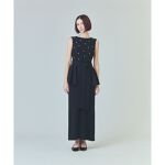 しなやかで上質感のあるロングドレス。ネックレスのようなビジュー刺繍、アクセサリーなしでも華やかに決まるデザインです。パンツなどにもレイヤード出来るリボンベルト付。