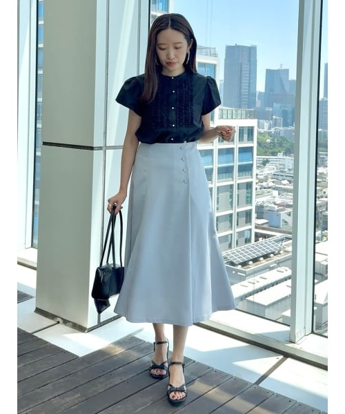 ブラックのブラウスは、細かなフリルとパールボタンがアクセントになり、華やかさをプラスしてくれます!フレンチスリーブで肩周りを程よくカバーしつつ、コンパクトなシルエットで全体がすっきり見えるバランス感も好印象?
