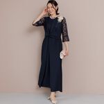 【マザードレス】ウエストクロスレースロングドレス 着用しやすいクルーネック。ウエスト部分はスタイルアップして見えるクロスデザインを入れて気になるお腹周りをカバーし、スカートはラップ風のデザインにしてさりげないアクセントを入れました。