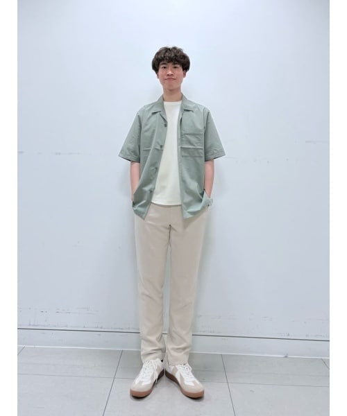 シャツは素材感として、しわになりにくい素材で、かつ接触冷感もあるので、暑い夏を快適に過ごせます。ボトムスは、リネンシャンブレーのパンツ。 グリーンとべージュといった組み合わせは、自然な印象を与えるだけでなく、柔らかく落ち着いた印象も与えてくれます。