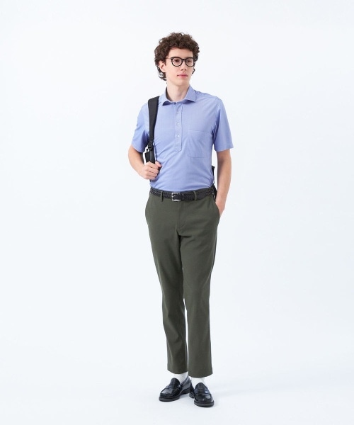 クールビズにピッタリの台襟付きドレスポロ。シャツ同様の設計になっており、すっきりとした襟が特長のカッタウェイカラー。アクセントとなるブランドピスネームが左脇に付きます。後襟ぐり、脇下部分には消臭機能のあるテープを縫い込んでおり、気になる臭いを抑えてくれます。