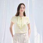 【トップス】胸元のラッフルデザインとリボンが魅力のブラウスです。フレンチスリーブで軽やかに仕上げ、腕を上げても脇が見えにくい仕様も嬉しいポイントです。【パンツ】透けにくく、吸水速乾や接触冷感など様々な機能性を兼ね備えた素材です。肌離れが良く、快適な着用感で長いシーズン活躍します。