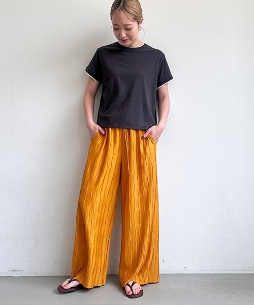 着用サイズ・カラー ■レイヤード半袖トップス L/Charcoal ■ウェーブプリーツパンツ M/Orange