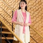 【大きいサイズ/L〜3Lサイズ】軽やかに羽織れてスッキリ決まるロングベストのスタイリング。ボタニカル柄のTシャツが程よい甘さを添えてくれます。