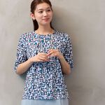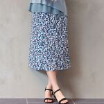 上品な幾何柄のセットアップならワンピース風に楽しめます。煌めき感のあるネックレスで華やかさを添えました。