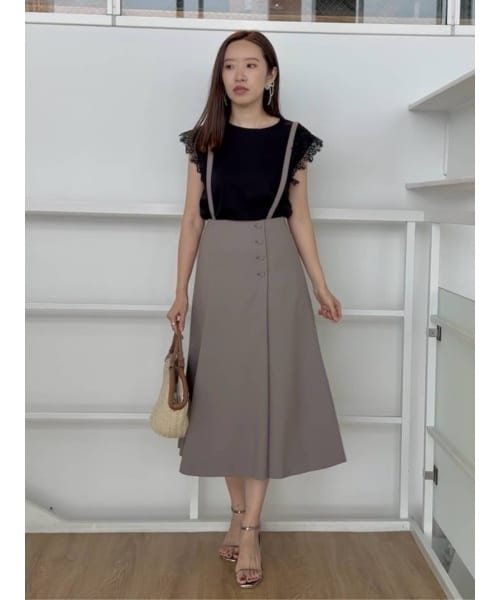 袖の繊細なレースがフェミニンな印象を演出するトップスは、落ち着いたブラックで甘さを程よく引き締めて大人っぽさをプラス!グレージュのスカートと合わせることで洗練された大人可愛い印象に♪