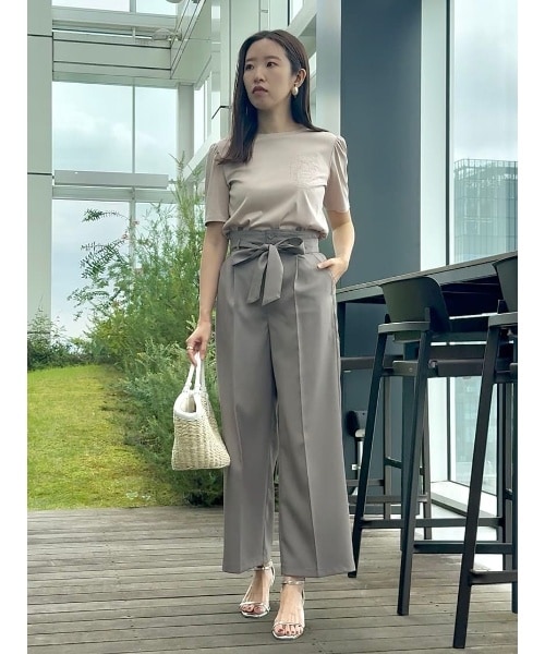 上品な光沢感のあるライトピンクTシャツが柔らかな印象を引き立て、肌なじみの良さが大人の余裕を感じさせます!トーンを揃えたワントーンコーデが、こなれ感のある洗練された印象を与えてくれます◎