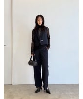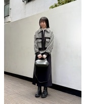 3色のオーナメント柄をブロッキングしたシャツとショートパンツのセットアップコーデ。
