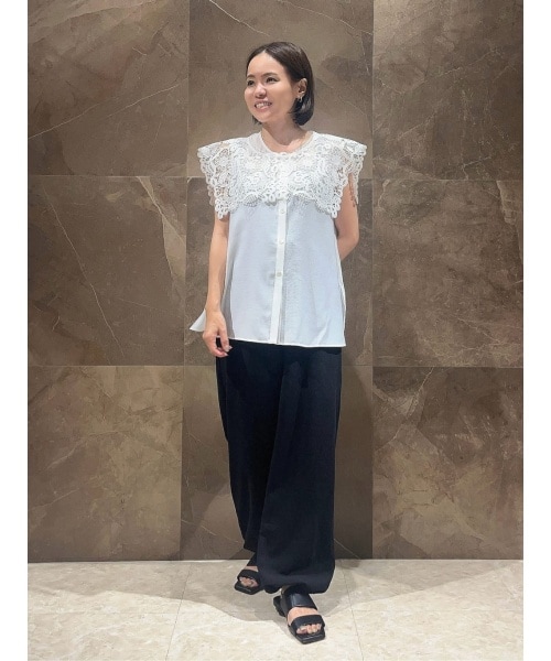 一枚で気映えする主役ブラウスをモードにブラックで合わせました。 1から図案を起こしたデザイナー拘りのケミカルレースの襟がポイント。少しツヤのある表情感ある素材。薄手で軽く、さらりと着られます。