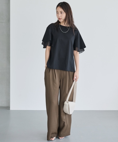 袖のフレア下には同系色のシフォンを重ねたデザイン。軽やかなシフォンを組み合わせることで涼し気な印象に。フェミニンな要素がありながらもカジュアルなカットソー生地を使用しているので、普段使いしやすいのもポイントです。