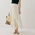 表情豊かな凹凸感が印象的な、 シアー感のある単色チェック素材を使用しています。 深めの合わせと深めのスリット入りで、 動きやすく足さばきもスムーズ。 歩くたびにふわりと揺れる、 動きのあるシルエットが女性らしさを引き立てます。