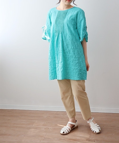 涼しげなコットンシャーリング素材のチュニックは、フロントのタックと袖のドロストがデザインポイント。二の腕をカバーした5分袖で軽やかに着こなせます。ボトムスはストレッチが効いたストレスフリーな細身パンツ。オフの日にぴったりのリラックススタイルです。