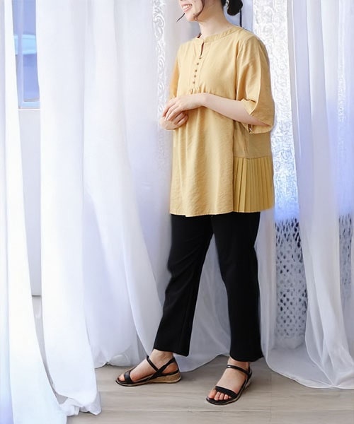 滑らかなワッシャー感のローン素材ブラウスは、レーヨン混で涼しく快適。脇のプリーツと5分袖がデザインポイントです。ボトムスはストレスフリーなストレッチ細身パンツで、すっきりとした印象に。大人のおしゃれを叶える夏の軽やかスタイルです。