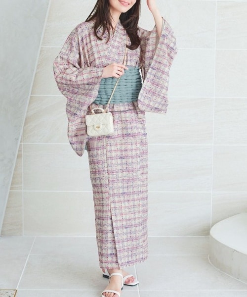 甘くなりすぎない、おぼろげなピンクが可愛い大人のピンク浴衣コーデ。