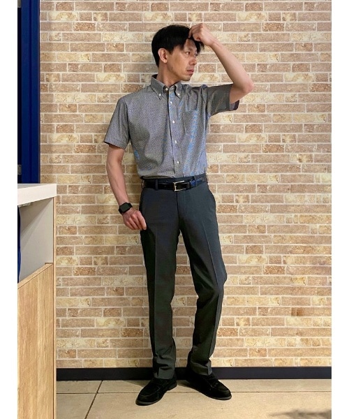 吸水速乾素材のご紹介です。 グレーのチェックシャツと濃グレーのパンツと合わせてモノトーンコーデにしています。 パンツを黒にしないことで夏でも重すぎない印象です。