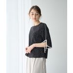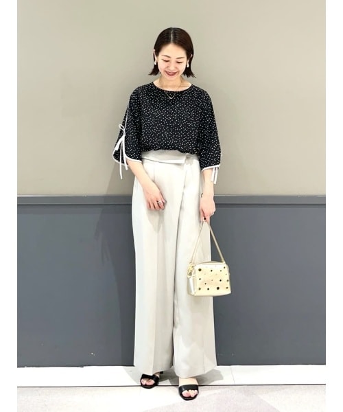 【着用サイズ ブラウス:F パンツ:S】袖のリボンディテールが今年らしいフェミニンなブラウス。デコルテが覗くクルーネックに、さらりとした表面のジョーゼット生地で仕立てた着心地の良いデザインです。