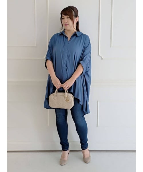 ブラウスは軽やかなレーヨン素材! ボタンを閉じてチュニック、ボタンを開けて羽織り風に着こなすことができます♪ 接触冷感機能でさらに涼しい!上半身にボリュームのあるアイテムなので、ボトムスはスキニーパンツを合わせてシンプルにスッキリとさせて簡単スタイルアップ♪
