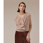 ふわっとしたフェザー素材が華やかなライトブルーのセットアップ。後ろ姿にポイントのある大きめフリルが目をひきます。