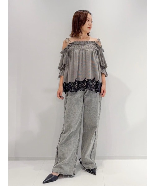 カットソー生地をベースに使用し、用尺をたっぷり取ってギャザーで贅沢なボリュームをだした華やかな一枚。ゆったりとしたシルエットとヘルシーな肌見せのバランスで、大人カジュアルなスタイリングにぴったりです。