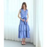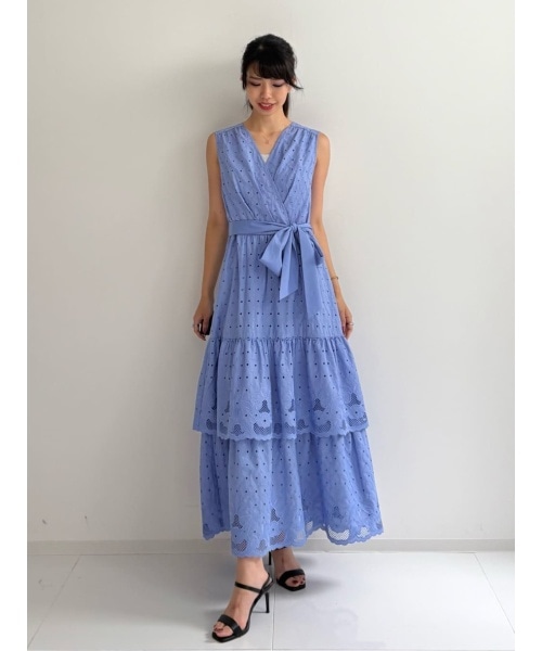 縦長シルエットと刺繍生地を使ったフェミニン系ドレスです。2段のティアードで甘さもありますが、裾に近づけることで大人の方でも程よく可愛いを出しています。ウエストリボンは取り外しができるので、ご自身のベルトに付け替えてアレンジも可能◎