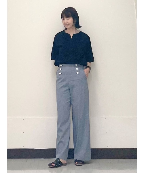 胸元のフリルが華やかなブラウスは、さらりとした着心地。マリンテイストのワイドラインパンツは程よい幅感。麻混なので、軽くてさっぱりした肌触りです。