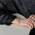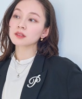 ゴールドのブレスレットがコーデのポイント! 耳にはビジューとフープピアスをレイヤードして華やかな仕上がり。